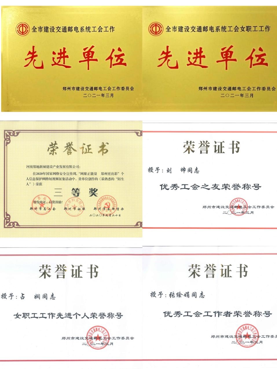 2021年3月22日,經(jīng)鄭州市建設(shè)交通郵電工會工作委員會研究決定,授予我公司工會鄭州市建設(shè)交通郵電系統(tǒng)“2020年度工會工作先進(jìn)單位”和“2020年度女職工工作先進(jìn)單位”榮譽(yù)稱號,并授予劉帥同志鄭州市建設(shè)交通郵電系統(tǒng)“2020年度工會之友”榮譽(yù)稱號,新城公司工會的占嫻和張繪娟兩位同志分別被評選為“優(yōu)秀工會女職工工作”和“優(yōu)秀工會工作者”先進(jìn)個(gè)人。
