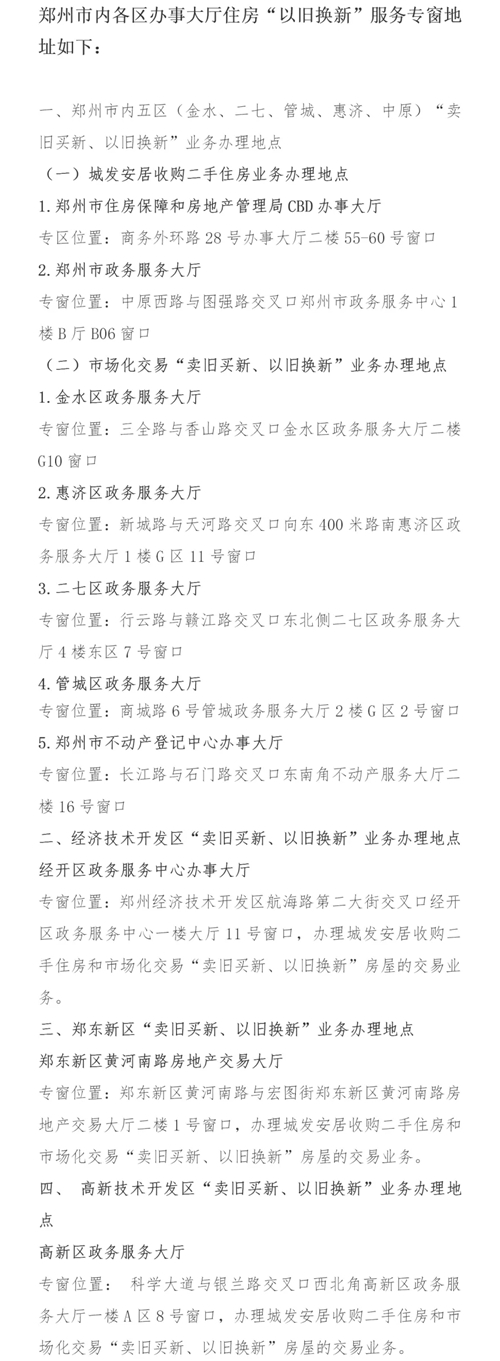 7月16日,記者從鄭州市房管局獲悉,為促進該市房地產(chǎn)市場“賣舊買新、以舊換新”政策進一步落實,鄭州市房管局會同稅務(wù)、不動產(chǎn)登記等部門,認(rèn)真梳理工作流程、全面開設(shè)服務(wù)專區(qū),全力推進住房“以舊換新”工作。目前,鄭州市內(nèi)8區(qū)10個辦事大廳均開設(shè)“以舊換新”服務(wù)專窗,辦理相關(guān)業(yè)務(wù)可享受“專人專窗”的服務(wù)。