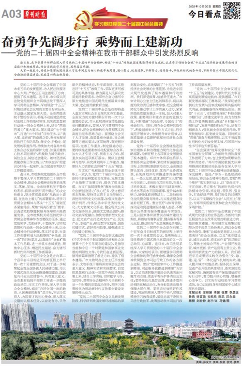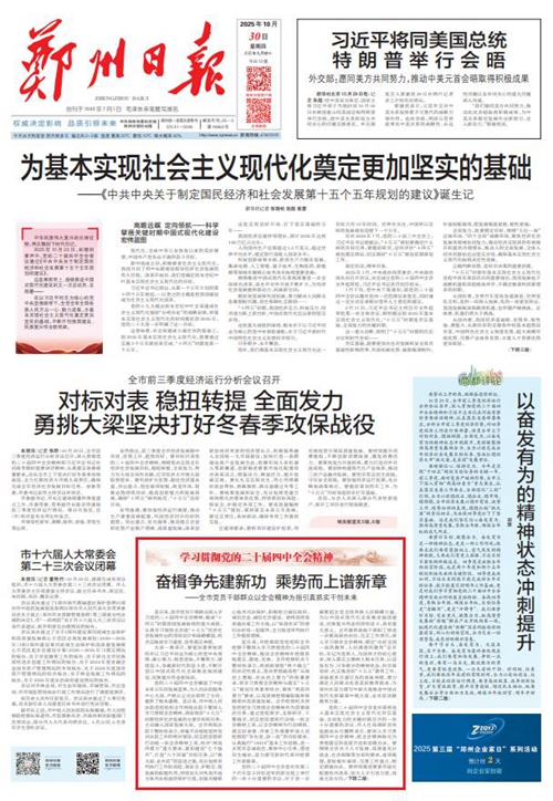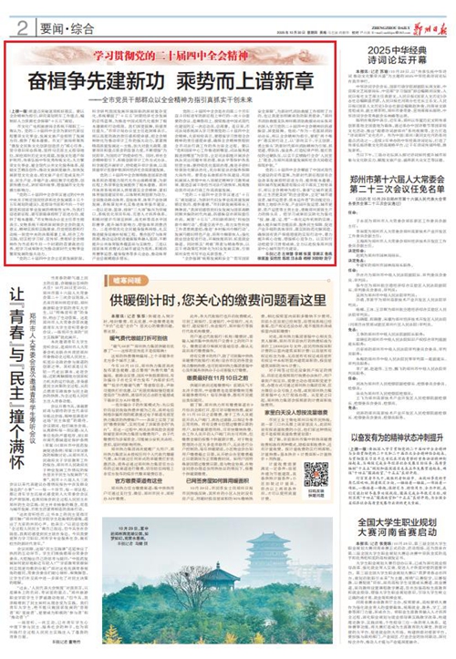 黨的二十屆四中全會擘畫了中國式現(xiàn)代化建設(shè)的宏偉藍圖,為新時代新征程國有企業(yè)改革發(fā)展指明前進方向、提供根本遵循,鄭州城發(fā)集團廣大黨員干部群眾深受鼓舞、倍感振奮。近日,《鄭州日報》《鄭州晚報》開設(shè)了【學(xué)習(xí)貫徹黨的二十屆四中全會精神】專欄,2025年10月30日,報道了鄭州城發(fā)集團深入學(xué)習(xí)貫徹落實黨的二十屆四中全會精神,以全會精神為指引真抓實干創(chuàng)未來。