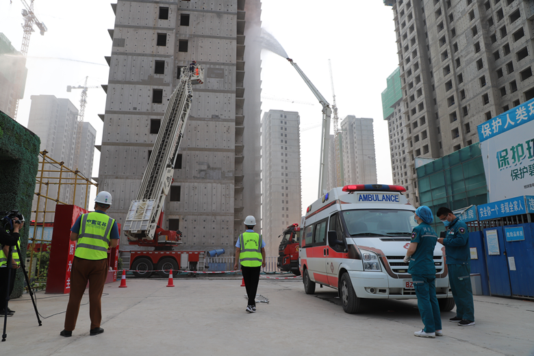 啟動儀式上,在工地現(xiàn)場開展了消防救援應(yīng)急演練。該環(huán)節(jié)模擬施工現(xiàn)場發(fā)生火災(zāi)時(shí),現(xiàn)場管理人員應(yīng)急操作反應(yīng)及配合市消防救援支隊(duì)展開滅火救援的案例。演練現(xiàn)場火災(zāi)模擬真實(shí)生動,4部消防車、1部救援車、1部救護(hù)車實(shí)地奔赴現(xiàn)場開展滅火及救援。整個(gè)演練過程現(xiàn)場組織嚴(yán)密、人員到位快速、操作程序得當(dāng),達(dá)到了預(yù)期效果。宣誓環(huán)節(jié),由中建二局三公司代表引領(lǐng)各參賽單位代表共同開展安全宣誓。趙新中為各參賽單位授旗。