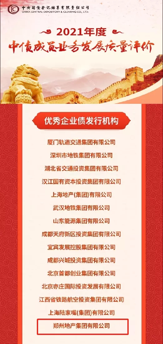 2022年1月4日,鄭州地產(chǎn)集團獲評中央國債登記結(jié)算有限責(zé)任公司(以下簡稱中央結(jié)算公司)發(fā)布的2021年度中債成員業(yè)務(wù)發(fā)展質(zhì)量評價“優(yōu)秀企業(yè)債發(fā)行機構(gòu)”。